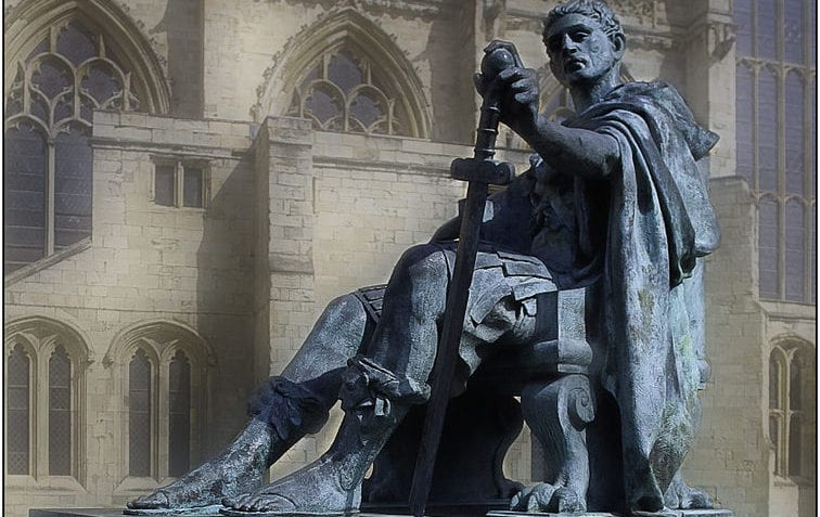 Constantino logró unificar nuevamente el imperio romano tras vencer a su contrario Licinio en 324 d.C., en torno a una monarquía imperial, absoluta y hereditaria, sobre la estructura autocrática de poder sentada previamente por su antecesor Diocleciano y validada espiritualmente por los argumentos teológicos de la religión a la que apoyaba. Tras apoderarse de Bizancio, la capital del imperio oriental que gobernaba Licinio, la reconstruyó con una nueva simbología cristiana y la rebautizó como Nova Roma